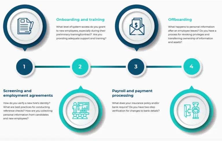 A data breach happens when personal, sensitive or protected information is accessed, disclosed without authorization, or is lost.  Throughout this guide we’ve presented a number of cyber security measures that HR and recruitment teams can put in place to reduce the risks associated with a data breach (and the resulting in financial loss, increased insurance costs, litigation and fines, and significant damage to your organization’s reputation).  These measures can be applied at various stages of an employee’s employment life cycle. This includes during: