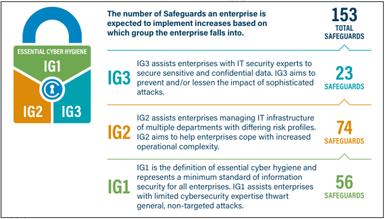 • Implementation Group 1 (IG1): The “Essential Cyber Hygiene” standard. A set of 56 safeguards that defend against the most common, non-targeted attacks.