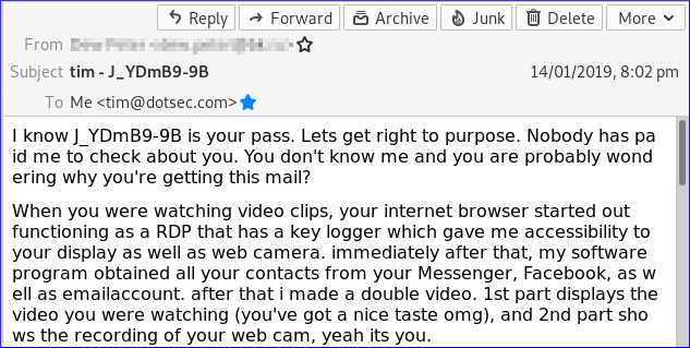 While poorly worded, the email can certainly appear alarming and indications are that perhaps the attacker does have a password, and could really carry out their threat.